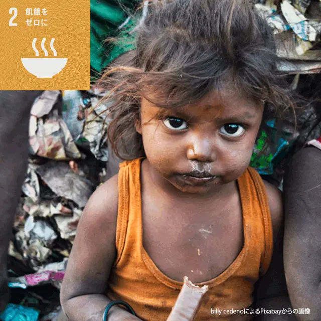 過去20年間の経済の急成長と農業生産の拡大により、栄養不良の人の割合はほぼ半減しました。かつては飢饉や飢餓に苦しんだ多くの開発途上国は、社会的最弱者層の栄養ニーズを満たせるようになっています。中央アジア、東アジア、ラテンアメリカ・カリブの各地域は、極度の飢餓撲滅に向けて大きな進捗を遂げています。これらはいずれも、ミレニアム開発目標(MDGs)で定められた目標達成に向けた重要な成果です。しかし残念ながら、極度の貧困と栄養不良は依然として、多くの国々の発展を妨げる大きな障害となっています。2014年の時点で、主として環境破壊や干ばつ、生物多様性の損失の直接的結果として、7億9500万人が慢性的な栄養不良に陥っていると見られています。また、9000万人を超える5歳未満児が低体重です。そしてアフリカでは、今でも4人に1人が空腹のまま眠りについています。持続可能な開発目標(SDGs)は、2030年までにあらゆる形態の飢餓と栄養不良に終止符を打ち、子どもや社会的弱者を始めとするすべての人が1年を通じて、栄養のある食料を十分に得られるようにすることを狙いとしています。そのためには、小規模農家の生活と能力を向上させ、土地や技術、市場への平等なアクセスを与えることにより、持続可能な農業規範を推進しなければなりません。また、国際協力によってインフラと技術への投資を確保し、農業生産性を改善する必要もあります。私たちは他のSDGsの目標も同時に達成することで、2030年までに飢餓に終止符を打つことができるのです。飢餓をなくすことは、持続可能な開発のための2030アジェンダを構成する17のグローバル目標の一つです。複数の目標を同時に達成するためには、包括的なアプローチが必要不可欠です。
