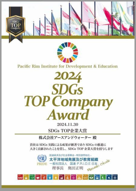 貴社は、SDGs推進評価委員会において最高評価を受け、SDGsTOP企業大賞を授与されました。ここにSDGs TOP企業賞(グランプリ賞)を授与します。