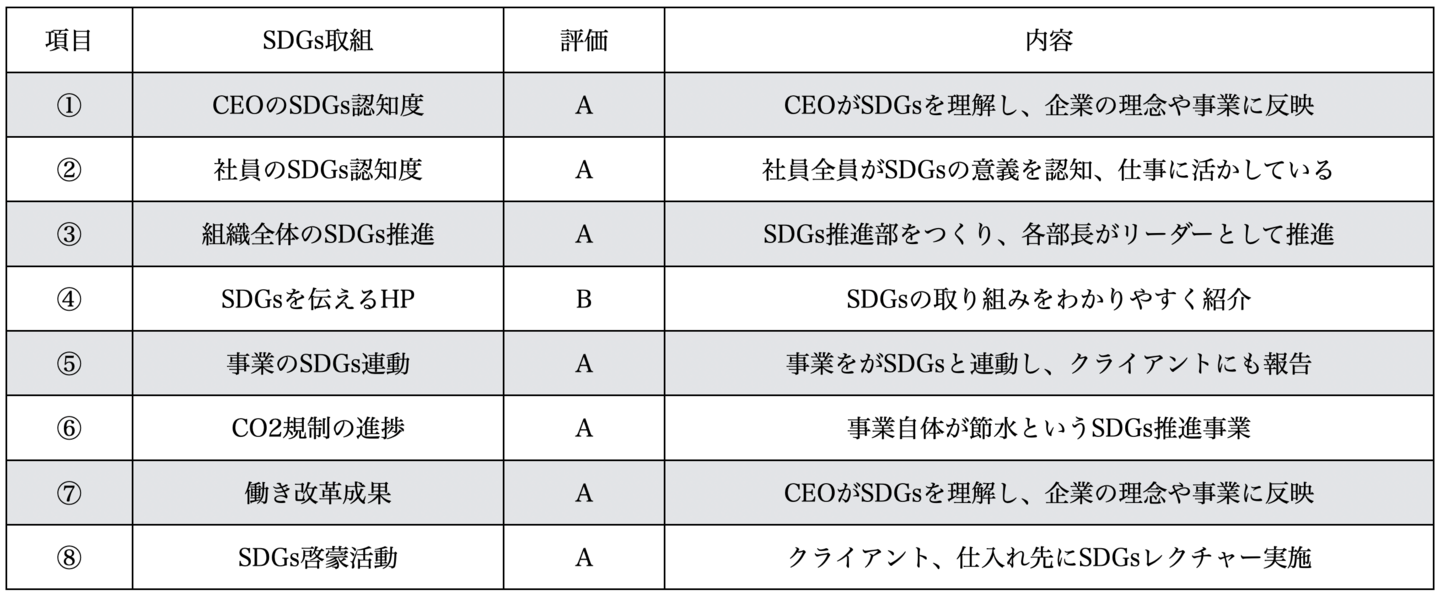 評価内容は、経営者がSDGsを理解し、自ら主導して社員全員にSDGs教育の機会を与え、社員も理解し、ビジネスにまた企業経営に反映され、また外部へのSDGs普及のためのレクチャーなど、実践的なSDGs促進に取り組まれまた点を高く評価しています。